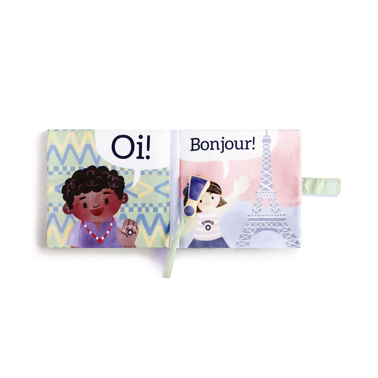 Turn early reading into a fun learning adventure with this soft “Hello! Around the World” sound book from Demdaco. Teach interactive play—and help little ones explore new languages—with this foam book that features bright colors and silver buttons kids can push to hear “hello” in eight different languages. Packaged and ready to gift, this entertaining book makes a great birthday or new baby gift.